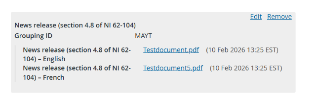 - Addition of document Grouping ID’s and English and French language suffixes for both News Releases (original and amended)