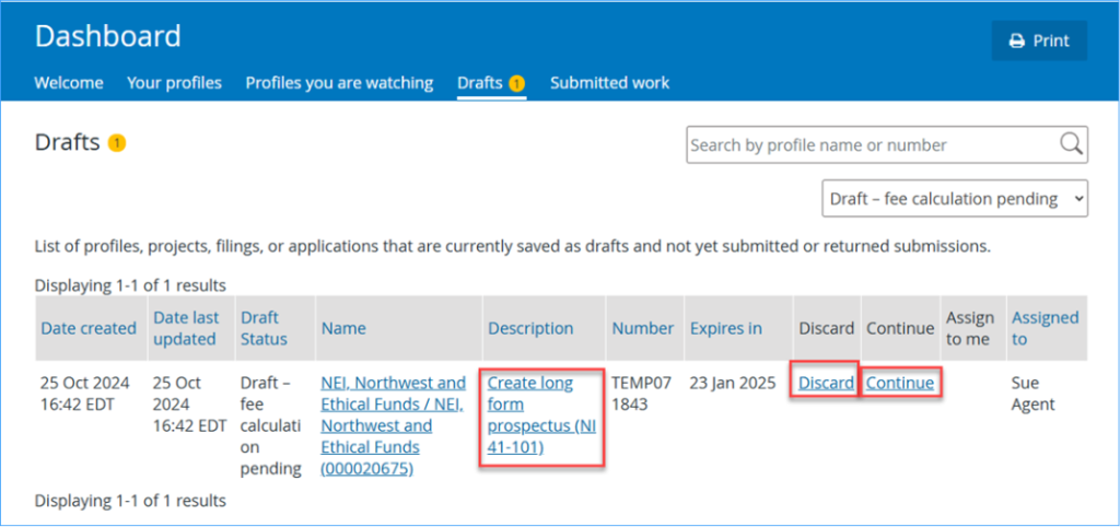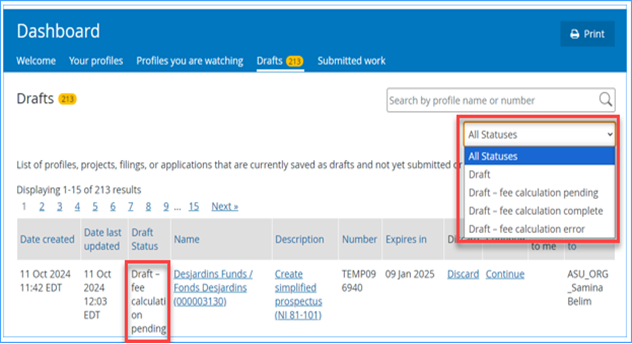 For investment fund group prospectus filings (long form prospectus, simplified prospectus and short form prospectus), the fee calculation process is done independently of the submission. The filing is displayed in your Drafts list with the status ‘Draft – fee calculation pending’. If there are no fees due on the filing, you will receive an email advising that the filing has been received and it will display on your ‘Submitted work’ tab.