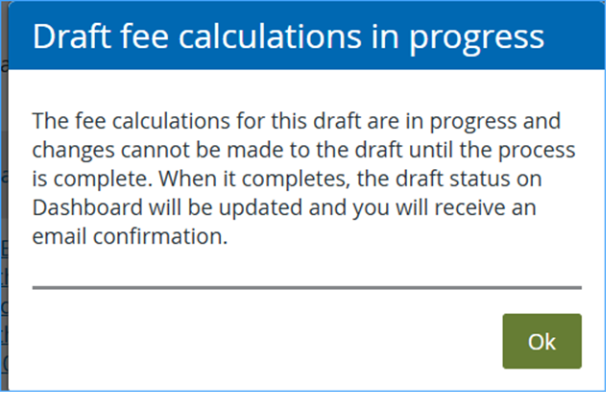 You are not able to make any changes to the draft while the fee calculation is in process. The warning message displays if you click on any of the links highlighted below:
